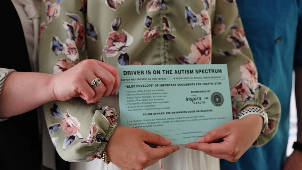 The program uses a simple tool. A blue envelope will hold the driver’s license, registration, and insurance documents. Clear directions for officers appear on the outside. The note explains that the driver may respond slowly or show signs of distress due to sensory pressure.